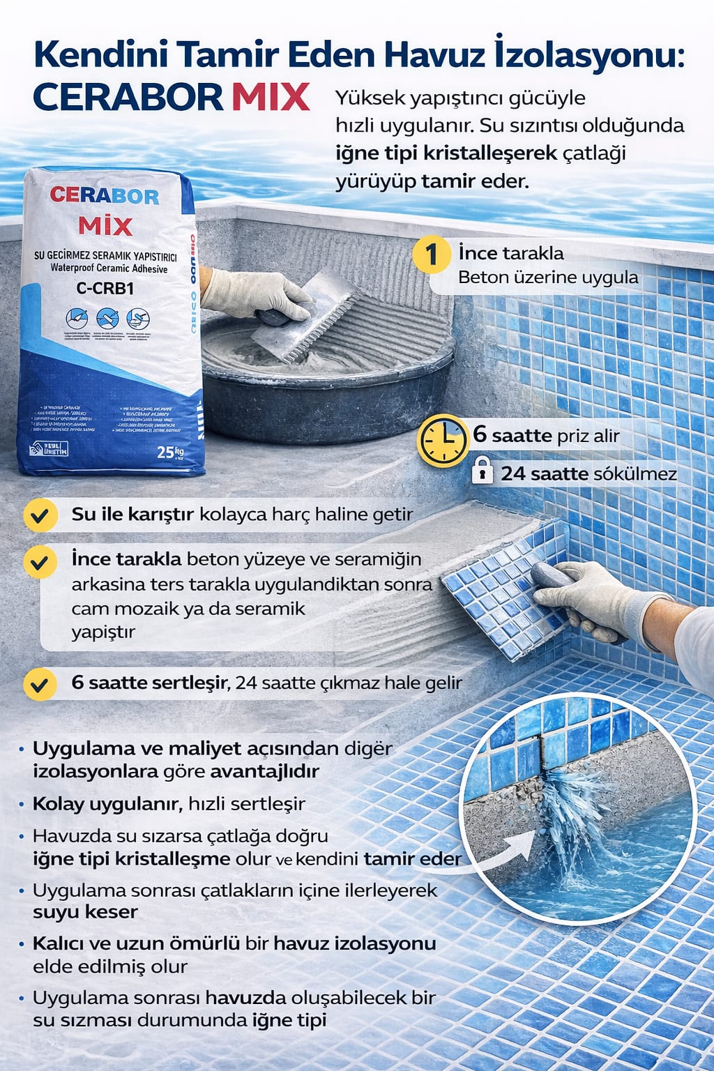 Avantajları: Bor katkısı sayesinde küf ve yosun oluşumunu engeller, yüzey dayanıklılığını artırır. Çatlak köprüleme kabiliyeti, yüksek aderans, düşük su emme oranı ve uzun servis ömrü sunar. İçme suyu depolarında güvenle kullanılabilir.