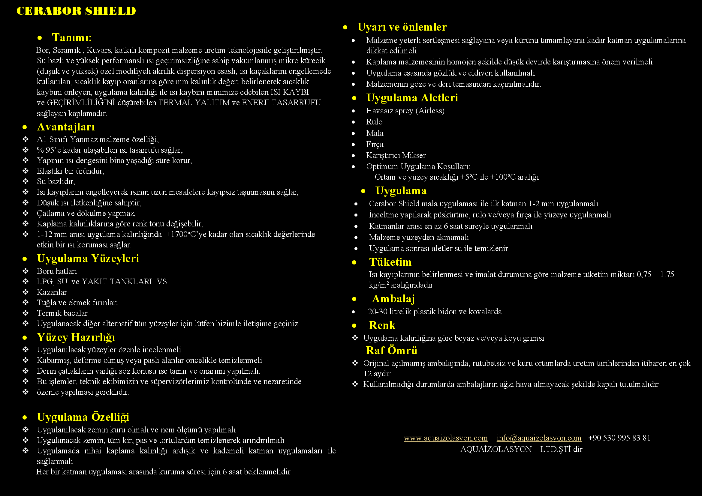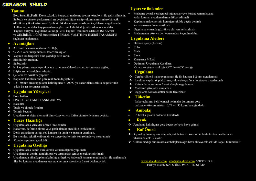 Cerabor Shield; genleştirilmiş bor ve genleştirilmiş seramik kürecikler ile geliştirilen, yüzeyin oksijen ile temasını keserek yanmayı ve parlama riskini ortadan kaldıran inovatif yalıtım çözümüdür. Isı – su – ses yalıtımını aynı anda sağlar, nem – rutubet ve küf oluşumunu engelleyerek uzun ömürlü koruma sunar.